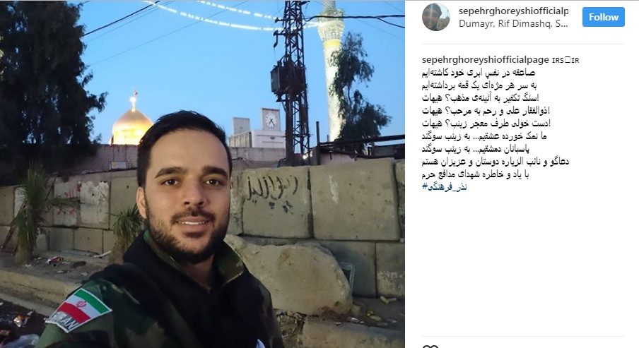 سپهر قریشی با هشتک نذر فرهنگی و لوکیشنِ ریف دمشق، استانی که تمامی سرزمینهای حومه شهر دمشق را در بر میگیرد ولی شهر دمشق جزو آن به حساب نمیآید، نوشت: «صاعقه در نفسِ ابری خود کاشتهایم/ به سر هر مژهای یک قمه برداشتهایم/ سنگ تکفیر به آئینه مذهب؟ هیهات!/ ذوالفقار علی و رحم به مرحب؟ هیهات!/ دست خولی طرف معجر زینب؟ هیهات!/ ما نمک خورده عشقیم... به زینب سوگند/ پاسبانان دمشقیم... به زینب سوگند/ دعاگو و نائب الزیاره دوستان و عزیزان هستم، با یاد و خاطره شهدای مدافع حرم.»