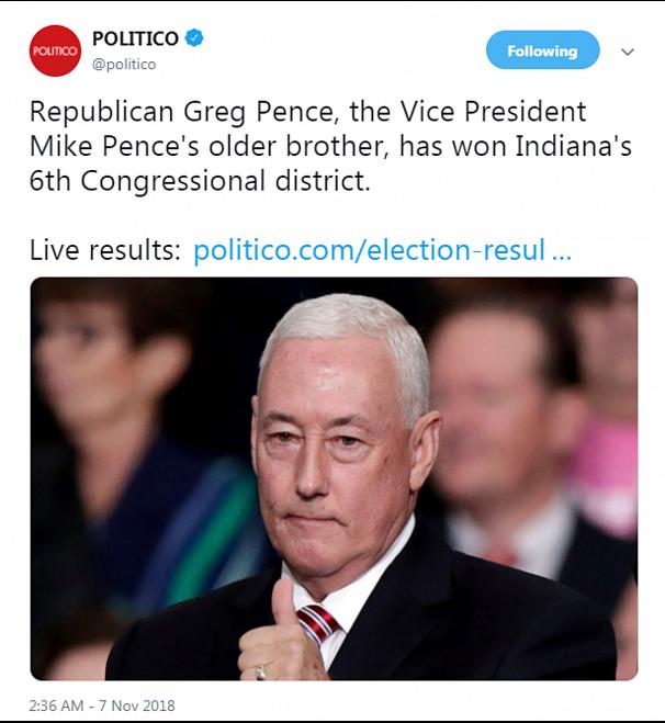 گرگ پنس، برادر معاون رئیس جمهوری آمریکا در انتخابات میان دوره ای به عنوان عضو مجلس نمایندگان انتخاب شد.